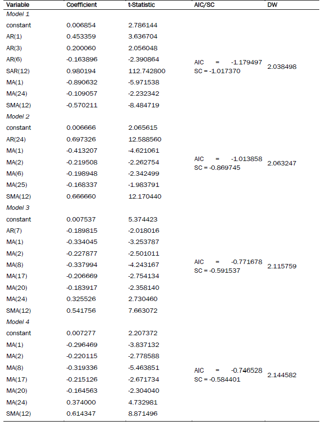 Table 3 presents estimates of four autoregressive models (AR), moving averages (MA) and integrated autoregressive models and moving averages (ARIMA), which previously reviewed the correlograms for verification and their seasonality, so it was estimated by the methodology of least squares to determine the behavior of the arrivals of international tourists to Puno during 2003:m1 to 2017:m9. Likewise, the Akaike Information Criterion (AIC), the Schwarz Information Criterion (SC) for the choice of the best model and the Durbin-Watson (DW) statistic were calculated for a first analysis of the presence of autocorrelation in the estimated models.