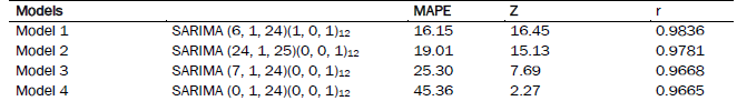 Likewise, to evaluate the efficiency of the ARIMA models of Table 3, the MAPE, Z and r statistics were constructed, which are shown below: