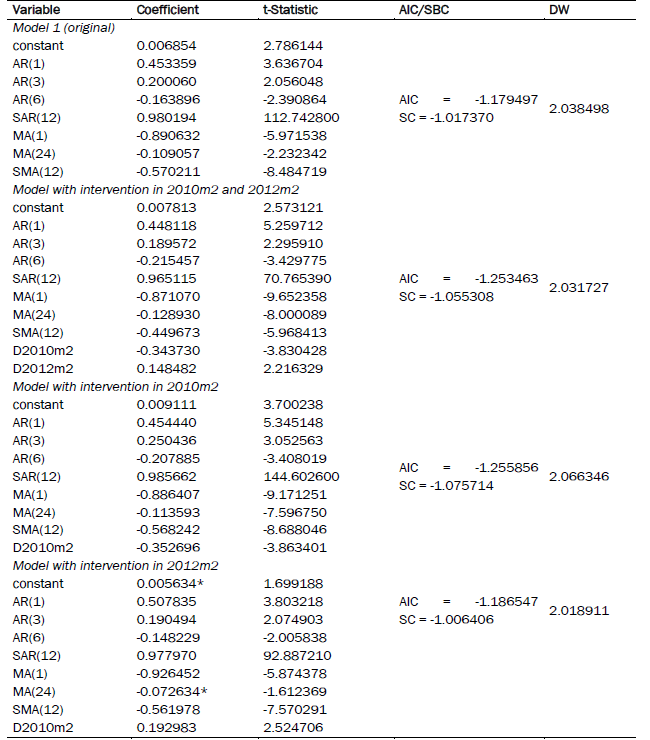 The results of Table 5 show the estimation of the SARIMA (6, 1, 24) (1, 0, 1)12 model previously chosen and three models that add to the indicated model the intervention in the 2010m2 and 2012m2 periods, giving as result that the best model ARIMA with intervention, is the model with intervention in 2010m2 where the variable that represents D2010m2 is statistically significant and where the model presents the lowest value of the statistics AIC (-1.255856) and SC (-1.075714) and with a value of DW = 2.066346 very close to 2, which would show the absence of autocorrelation in this model. Likewise, this SARIMA (6, 1, 24) (1, 0, 1)12 model with intervention in 2010m2 presents the statistics of AIC and SC smaller than the Model 1 because the break is being corrected in that period.