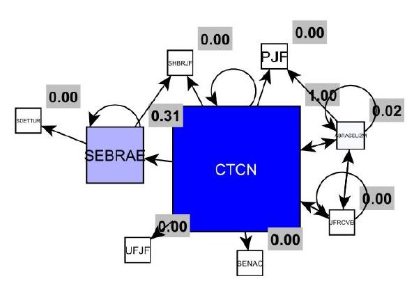 In the case of this network, there are only two centralities - CTCN and SEBRAE - with greater functionality, according to what is indicated by the indices generated between the relationships of the actors calculated by the yED software between nodes intercession centrality tool (Table 02).