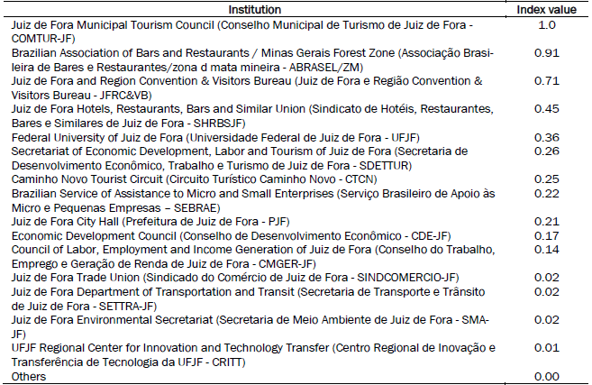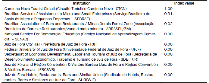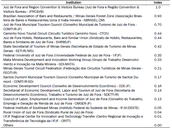The visualization of this 'observed network' presents, as a general panorama, the existence of many central entities that can exert direct and indirect influence on the complex relationships formed in a network of social and institutional relations. The sociogram indicates that this centrality is mostly composed of entities linked to or belonging to the city of Juiz de Fora. Some are local (COMTUR JF) and others, although they have regional coverage (such as Convention Bureau, ABRAZEL/ZM, among others), they have headquarters in the city of Juiz de Fora, where they mostly act. When viewing the contents through the regional lens grounded in public tourism policies, the CTCN appears in fourth place, with 0.44 index, shared with SHRBSJF. That result demonstrates that the regional instance of governance is far away from its ideal position as a central agent, tourism promoter, and responsible for regional governance of the policies of the sector. This result reinforces the polarity of the city of Juiz de Fora indicating an imbalance in the tourism development processes in the region, still concentrated in its inductor destination.
