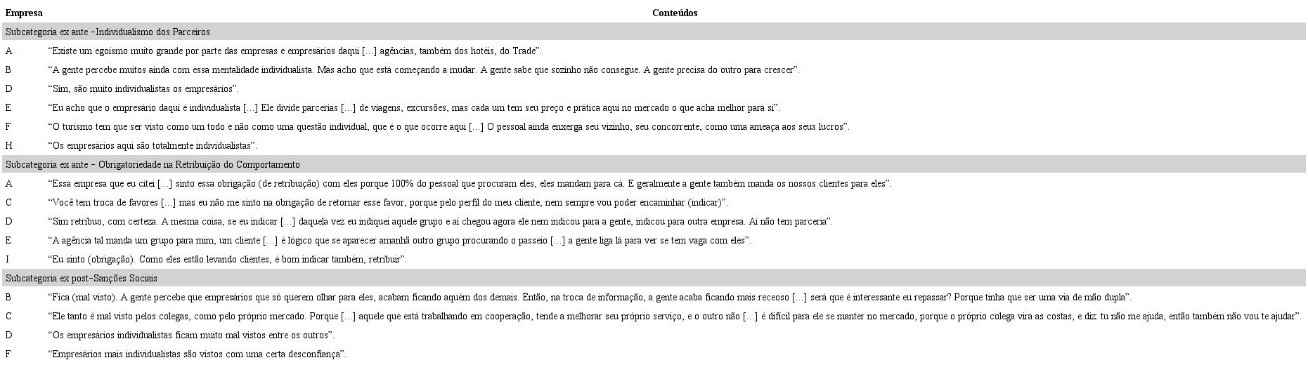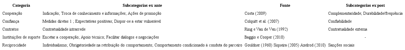 Este estudo focou em cinco categorias – cooperação, confiança, contratos, instituições de suporte e reciprocidade – e partiu das subcategorias ex ante identificadas no referencial teórico. Para a cooperação, a bibliografia base foi o estudo de Costa (2009), enquanto que, para a confiança, seguiu-se as subcategorias recomendadas por Colquitt et al. (2007). Com relação às outras três categorias (elementos vinculados), utilizou-se as subcategorias ex ante debatidas nos trabalhos de Axelrod (2010), Baggio e Cooper (2010), Gouldner (1960), Ring e Van de Ven (1992) e Siqueira (2005), principalmente. Em sequência, a coleta de dados propiciou a identificação de novas subcategorias (ex post) na exploração dos temas. Estas subcategorias não previstas inicialmente foram incorporadas às análises e forneceram maiores subsídios para a discussão, fato que reforça as características exploratórias desta investigação (Quadro 1).