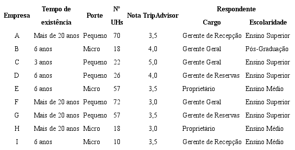A unidade de análise se refere às empresas parnaibanas ligadas à hospedagem – hotéis e pousadas – e avaliadas no sítio TripAdvisor até setembro de 2016. A partir disso, chegou-se ao universo de 17 empreendimentos e, para a determinação dos sujeitos da pesquisa, foram utilizados os critérios de adesão e saturação teórica (Fontanella, Ricas & Turato, 2008). Por fim, chegou-se ao total de nove empreendimentos entrevistados. A Tabela 1 auxilia na contextualização dos participantes da pesquisa.