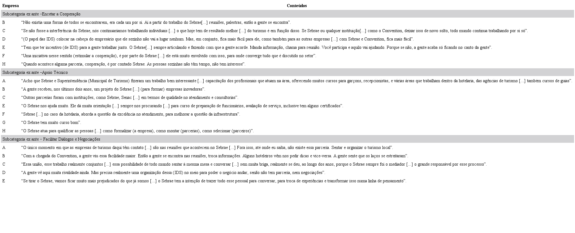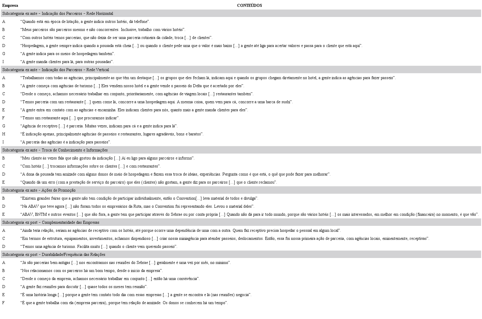 O Quadro 2 mostra que as subcategorias ex ante foram confirmadas e que surgiram duas categorias novas (ex post): “complementaridade das empresas”e “durabilidade/frequência das relações”.