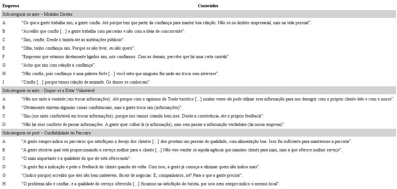 Na categoria confiança, surgiu uma nova subcategoria,“confiabilidade do parceiro”, e apenas a subcategoria“expectativas positivas”, não houve conteúdo suficiente para comprová-la (Quadro 3).