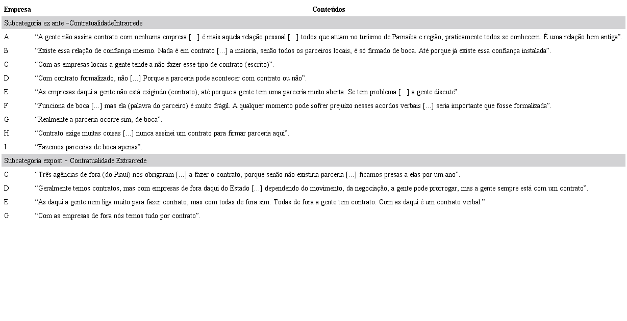 Nesta categoria surgiu um tema novo, relacionado aos contratos estabelecidos extrarrede (Quadro 4).