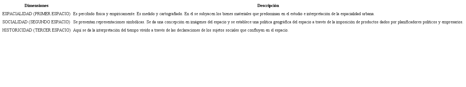 Soja menciona que para comprender la complejidad de la realidad, es necesario hacerlo trialécticamente: estar en el mundo, entenderlo e interpretarlo. (Guzmán, 2007). Es así que ninguna dimensión del espacio puede ser comprendida aisladamente.