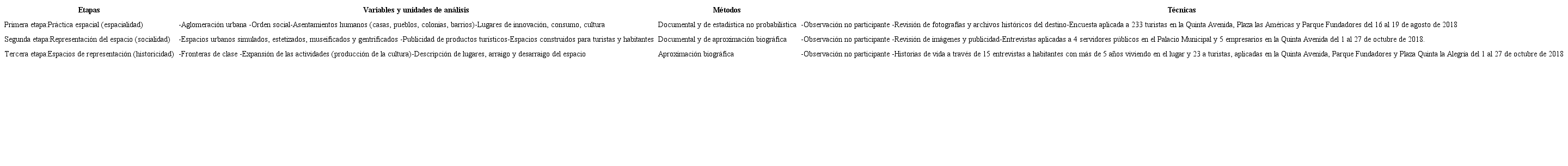 El proceso de investigación fue mixto, combinando técnicas cuantitativas y cualitativas, y se dividió en tres etapas, cada una enfocada a trabajar las dimensiones espaciales dadas por Soja (2008) según se expone en la Tabla 2: