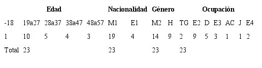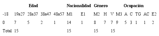 La selección de estos sujetos fue aleatoria, sin embargo cada uno aportó distintas experiencias de su visita al destino, a continuación se demuestra en una tabla su perfil, siendo clasificados por edad, nacionalidad, género y ocupación, para conocer a más detalle la representación del espacio.