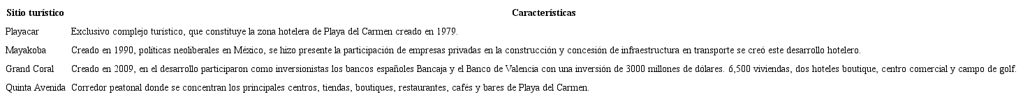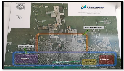 Es particularmente interesante que, de acuerdo con varios estudios (Córdoba & García, 2003; Quiroz, 2006 y Plan de Desarrollo Municipal, 2016-2018), Playa del Carmen es una ciudad que se encuentra dividida por la carretera federal, creando dos ciudades. Por un lado la ciudad que está dirigida al turismo se encuentra de lado oriente hacia la línea costera, con un ordenamiento y construcción de residencias, comercios, etc., para clases media alta y alta, mientras que al poniente de la carretera, se ubican las viviendas y comercios destinados a cubrir con las necesidades de los trabajadores, los cuales se desplazan diariamente a la ciudad del turismo para hacerse cargo de la limpieza, jardinera, y demás servicios generales. Se puede apreciar la división en la Imagen 1, en donde se ubican los sitios turísticos de mayor concentración y producción de capital, en su mayoría de capital extranjero, los cuales han sido causa del crecimiento de colonias habitadas por inmigrantes que se instalan para trabajar mayoritariamente en establecimientos turísticos.