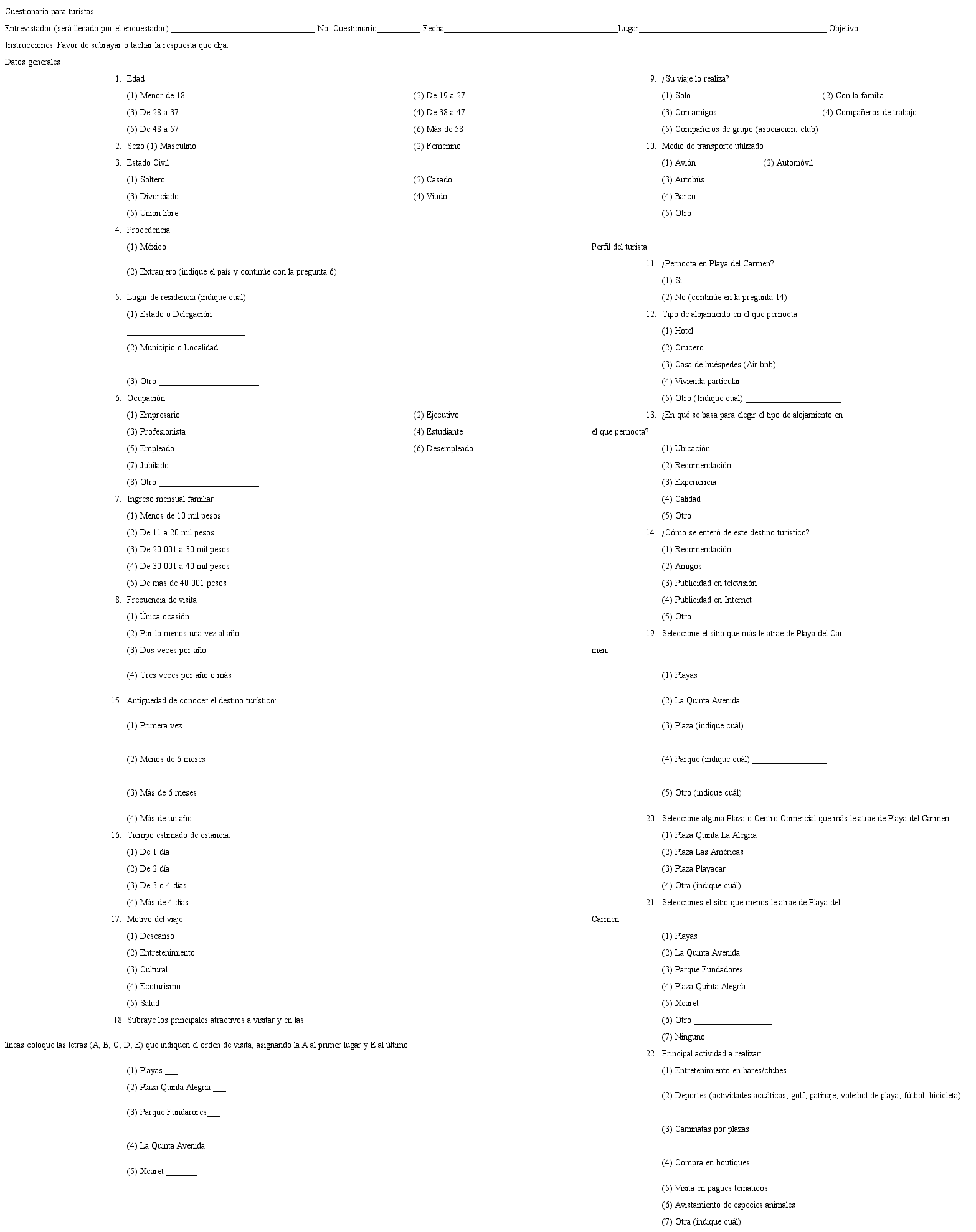 La encuesta se aplicó a 233 turistas, a través de un cuestionario conformado por 33 preguntas. El método de selección de los encuestados fue aleatorio simple, a través de un sistema PAPI de recogida de datos en los puntos mencionados en la tabla anterior.
