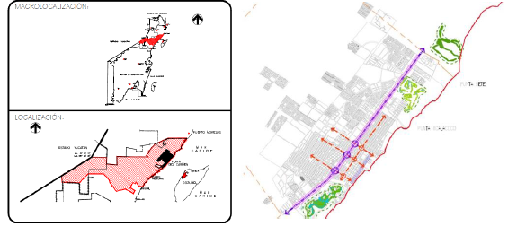 La línea de color morado señala la carretera Cancún – Tulum, a través de la cual se trasladan las personas tanto turistas como residentes para llegar al destino. De la misma manera las líneas en rojo significan los corredores urbanos existentes. La carretera, divide las zonas residenciales con la zona turística y hace constar que las colonias (zonas de color gris) fueron construidas cercanas a la zona turística, la cual se encuentra ubicada cerca de la costa (franja cuadriculada de color morado) en esta se ubica la Quinta Avenida, siendo el sitio con más establecimientos turísticos de la ciudad. Los sitios coloreados de color verde, son los complejos turísticos con campo de golf, de los cuales el mayor de ellos, perteneciente a Playacar, se aprovechó de los lagos con los que cuenta el destino y se apropió de ellos para incorporarlos como atractivo a su establecimiento. Lo cual hace alusión a los espacios turísticos de preferencia ya mencionados anteriormente por los turistas.