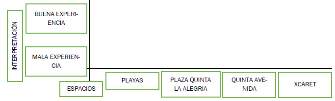 Por medio de las entrevistas aplicadas a los turistas, se obtuvo información que permite la visión de la dimensión de la espaciliadad en Playa del Carmen, algunos de estos se relacionan con los datos adquiridos en las encuestas aplicadas. Iniciando con la aglomeración urbana que se ha ido generando en el sitio, por las colonias que se desarrollaron poco a poco debido al incremento de la actividad turística, las empresas turísticas y los corredores urbanos de la ciudad. Por lo tanto se presenta la siguiente imagen.