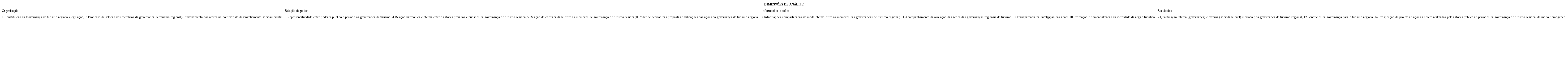 No intuito em alcançar resultados plausíveis, mensuráveis e factíveis a respeito das governanças regionais de turismo da pesquisa, foi utilizado 14 categorias de análises e 4 dimensões analíticas como demonstrados na subseção posteriori.