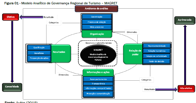 A busca por uma modelo analítico foi principalmente ocasionado por não haver uma região turística no Brasil como modelo exponencial que fosse o parâmetro para as demais, e provavelmente não haveria essa possibilidade de uma governança modelo para um país de dimensões continentais como o Brasil, com peculiaridades e diversidades de governos e gestões estaduais e municipais. Neste sentido, buscou-se elaborar um modelo que permitisse compreender a gestão das governanças regionais, por diversos prismas, desde sua constituição até aos seus resultados, sendo que as governanças podem ser analisadas pelo modelo de forma conjunta ou individualizada. Inclusive mesmo que as governanças sejam distintas, é possível obter uma compreensão com a utilização das suas categorias e dimensões analíticas.
