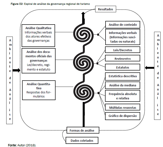 A aplicação da Modelo Analítico de Governança Regional de Turismo (MGRT) proporcionou utilizar métodos diferentes, mas, que se complementaram no sentido de obter conteúdo que subsidiassem a compreensão das regiões empregando o modelo proposto. Desta forma, a figura 02 demonstra o processo de análise que ocorreu com a espiral de análise de governanças regionais de turismo, e dos componentes que foram usados para alcançar os resultados propostos nesta investigação.
