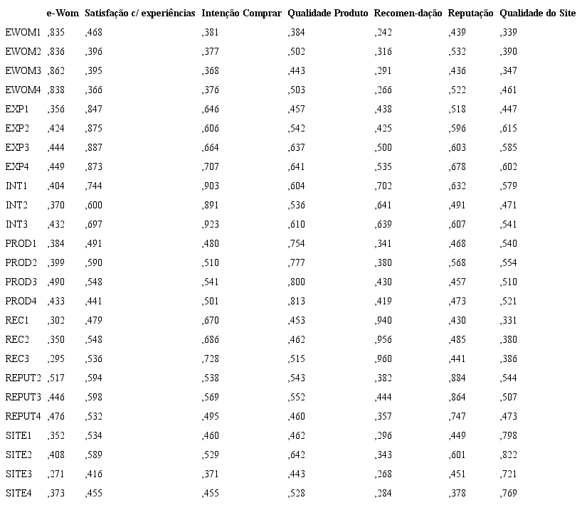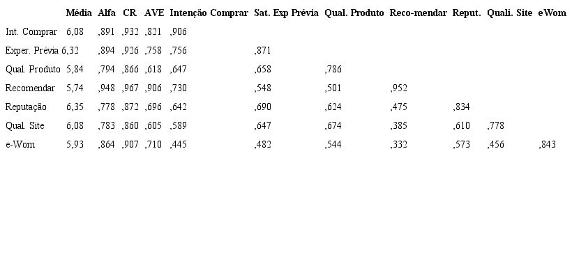 Com base nessa metodologia, os dados são analisados e interpretados em duas etapas: (1) a avaliação do modelo de mensuração e (2) a avaliação do modelo estrutural. Para se avaliar o modelo de mensuração, foram verificadas as validades discriminante e convergente do modelo através da análise fatorial confirmatória (AFC) (Tabela 1). A validade discriminante é estabelecida quando um indicador apresenta a carga fatorial em seu construto original maior do que todas as suas cargas cruzadas com outros construtos. Espera-se que as cargas fatoriais atinjam um mínimo de 0,70 no seu respectivo fator, e cargas mais baixas nos demais fatores. Para isso, foram avaliadas as cargas fatoriais de todos os construtos do modelo, o qual sugeriu a eliminação de um item, presente no construto Reputação por não atender este critério. Gerou-se novamente o algoritmo PLS, e a solução confirmou todos os itens apresentando elevadas cargas fatoriais (superiores ou iguais a 0,70, conforme sugere a literatura), sendo estatisticamente significativas ao nível de 5%, nos seus respectivos constructos (indicando confiabilidade dos itens).