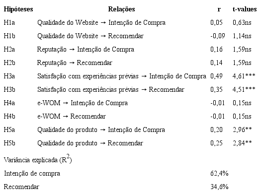 De modo a se analisar o modelo estrutural, também se utilizou o software SmartPLS 3.0, através da técnica de bootstrapping com 5.000 amostras, avaliando a aderência geral do modelo, bem como de seus parâmetros. A Tabela 3 apresenta os resultados do modelo e dos testes de hipóteses.