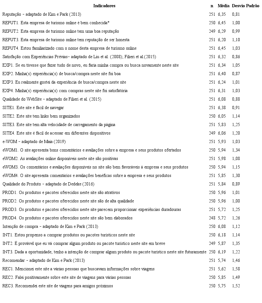 De modo a se caracterizar a amostra do estudo, destacam-se as principais características dos 251 participantes. Quanto ao gênero, 170 (67,7%) mulheres e 81 (32,3%) homens responderam à pesquisa. As faixas de idade predominantes concentram-se entre 20 e 30 anos (45,8%) e entre 31 e 40 anos (33,1%). Quanto ao estado civil, solteiros (55%), seguidos de casados (31,9%) representam a grande maioria da amostra. As faixas de renda predominantes por pessoa concentram-se entre 1 e 3 salários mínimos (37,5%) e entre 3 e 5 salários mínimos (21,1%). Em relação à escolaridade, 30,7% possuem graduação e 49,8% pós-graduação. Os respondentes concentram-se, em sua maioria, nos estados do Rio Grande do Sul (n = 129; 51,4%), São Paulo (n = 42; 16,7%) e Santa Catarina (n = 19; 7,6%). Do total de respondentes, 94% efetivaram a compra do produto turístico pesquisado, enquanto 6% realizaram apenas a busca do produto turístico no site, mas não concluíram a compra.