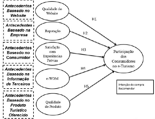 Assim, com base na literatura, foram identificados diferentes antecedentes que podem influenciar a participação dos consumidores no turismo eletrônico, os quais podem ser agrupados em antecedentes baseados no website (Qualidade do Site), na empresa (Reputação), no consumidor (Satisfação com experiências prévias), na informação de terceiros (e-WOM) e no produto turístico oferecido (Qualidade do produto). A partir desse levantamento, justifica-se a proposição de hipóteses a serem testadas empiricamente, as quais são destacadas na próxima seção, juntamente com a sua fundamentação teórica.