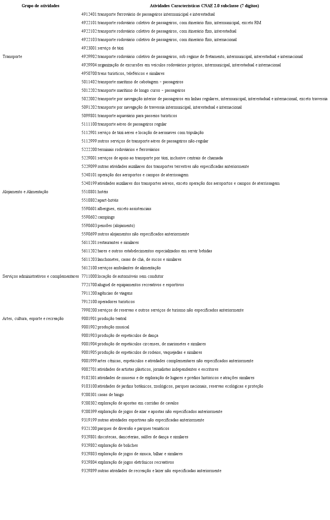 Com essa compatibilização, torna-se possível mensurar a dimensão da Economia do Turismo e trabalhar com outras fontes de informações como o Ministério do Turismo, o Instituto de Pesquisa Econômica Aplicada (Ipea) no Sistema de Informações sobre o Mercado de Trabalho no Setor Turismo (SIMT) e a Fundação João Pinheiro (FJP), que já utilizavam as CNAE anteriormente. O quadro 1 apresenta a listagem das atividades consideradas ACTs no presente trabalho com seus respectivos códigos CNAE 2.0 subclasse.