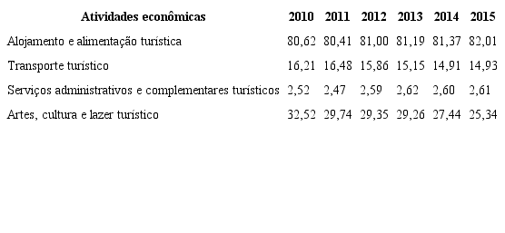 No caso do Brasil, os pesos apresentaram uma variação muito pequena ao longo dos anos. Destaca-se que a parte turística da atividade de alojamento e alimentação é bastante significativa, uma média de 81,10% no período de 2010 a 2015, seguido pela parte relativa às artes, cultura, esportes e lazer (média de 28,94% no período), na sequência o transporte (média de 15,59% no período). O mesmo não acontece com os serviços administrativas e complementares, apenas 2,57% deles são considerados turísticos utilizando a massa salarial.