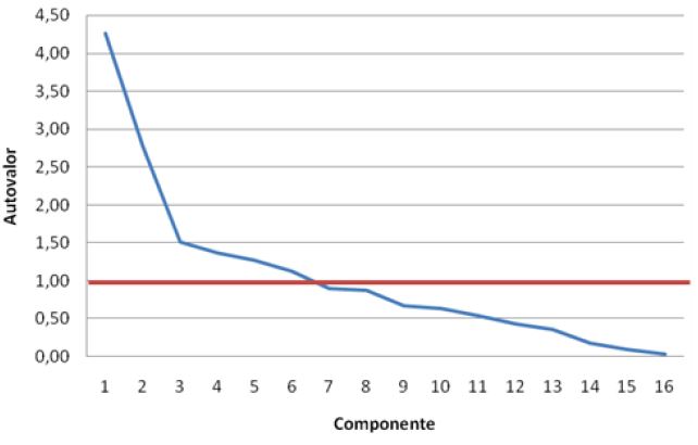 Por lo expuesto, se optó por conservar las cuatro componentes iniciales tal como sugiere el primer criterio. Las cargas factoriales (coeficientes de correlación lineal entre cada una de ellas y los componentes) y los componentes se describen en la Tabla 4.