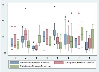 Características. Este grupo se caracteriza por tener municipios con una alta participación de los recursos deportivos en sus recursos totales: entre 7,1% y 40%, con un 50% de los municipios que exceden el 23%. El 75% de los municipios se encuentran a una distancia de más de 271 kilómetros de la ciudad capital y tienen una baja densidad en comparación con los otros grupos: entre 2,4 y 11,4 habitantes por kilómetro cuadrado. Este grupo es uno de los tres grupos con los mejores indicadores de infraestructura: la proporción de la población que no tiene acceso al agua potable no supera el 38% y la proporción de hogares con déficit no supera el 2,5%. En cuanto a la participación de la Actividad de Alojamiento y Restaurantes en la economía local, esta no supera el 2,2%.