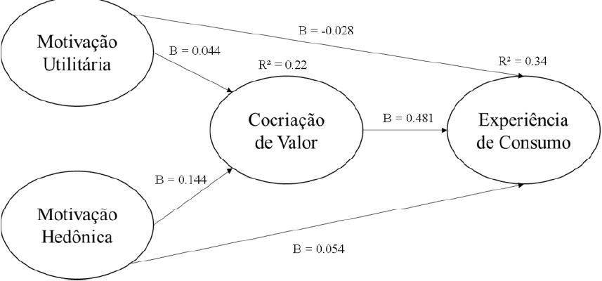 Neste mesmo sentido, verifica-se ainda que a motivação utilitária não apresenta associação significante com a cocriação de valor (β = 0.044, p = 0.269). Desse modo, não há evidências suficientes para rejeitar a hipótese nula (H3 não suportada). Muito embora a literatura reconheça que a cocriação apresente elementos associados tanto a aspectos hedônicos quanto utilitários (Verleye, 2015), este resultado sugere que o papel das motivações utilitárias pode variar conforme o tipo do serviço e sua proposta de experiência, como no caso de serviços de hospedagem para turistas (Prebensen & Xie, 2017).