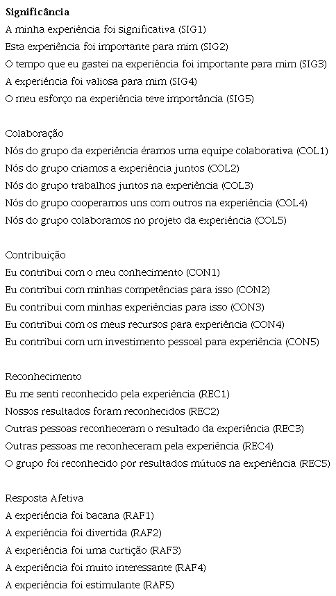 Algumas pequenas adaptações foram necessárias para um melhor ajuste e entendimento da escala quando relacionada a experiências turísticas reais. Uma última mesa redonda foi feita com 3 especialistas em cocriação de valor e turismo, e o resultado final da escala é apresentado na tabela 3 a seguir.