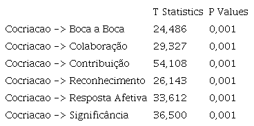 Por fim, a pesquisa utilizou o teste de Bootstrapping para mensurar os intervalos de confiança, testes de hipóteses e situações inferenciais complexas (Efron & Tibishrani, 1993), e o teste R² para medir o quanto a cocriação de valor explica a intenção de recomendação boca-a-boca.