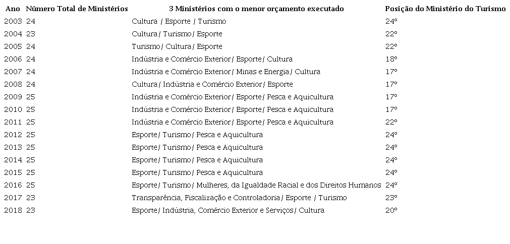 Em 2003, quando foi criado, o Ministério do Turismo foi o ministério que executou o menor orçamento da União (tabela 1). Durante o primeiro mandato do presidente Lula, o Ministério do Turismo, o Ministério da Cultura e o Ministério do Esporte formaram o grupo dos ministérios com os menores orçamentos. Mas essa situação mudou consideravelmente no segundo mandato. Em 2007, o MTur passou a ocupar a 17ª posição no ranking orçamentário de um total de 24 ministérios, essa posição se manteve até o ano de 2010.