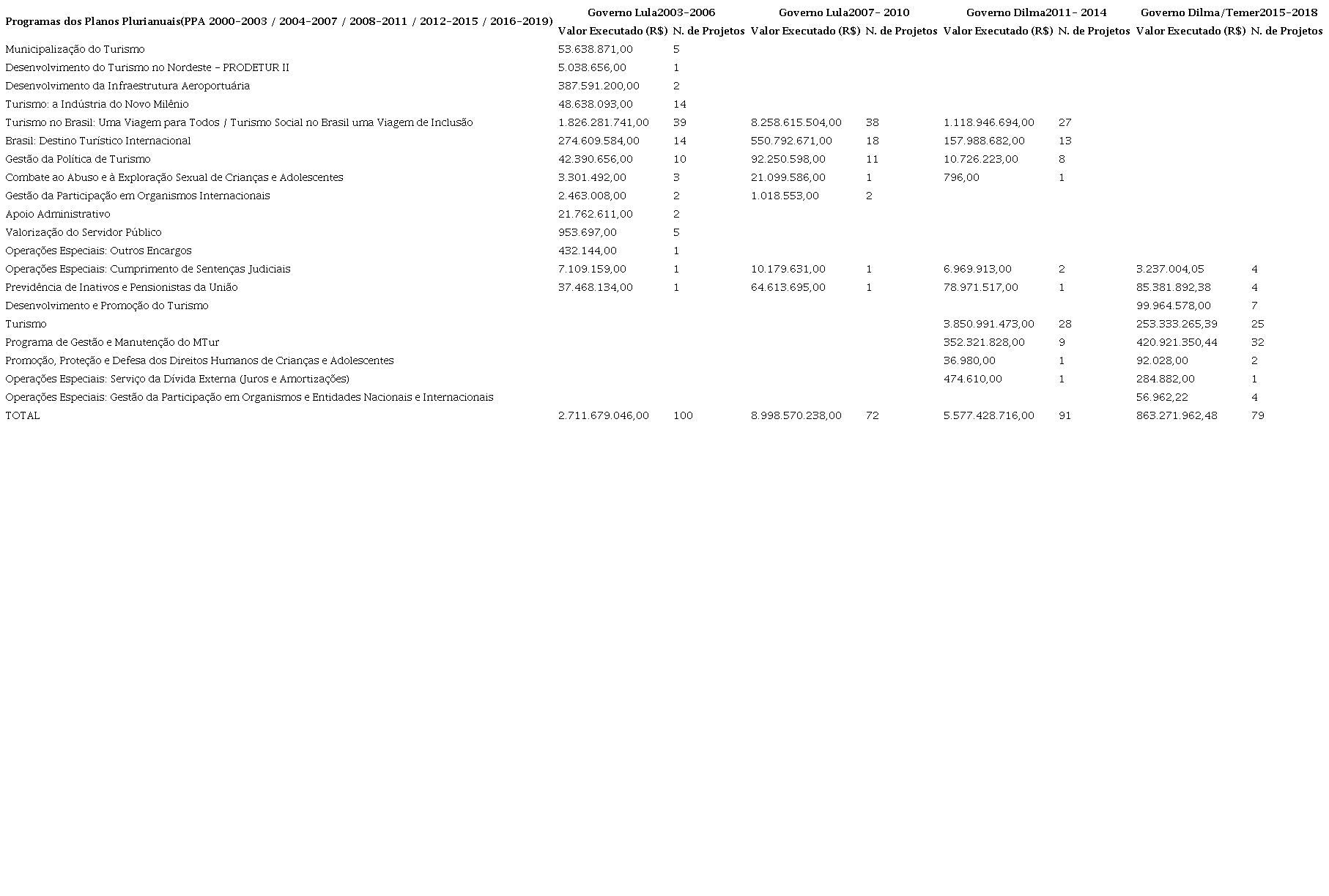 Isso significa que em 2003, no primeiro ano do governo Lula, o Ministério do Turismo aplicou recursos em programas da gestão do governo anterior, tais como: Programa Nacional de Municipalização do Turismo (R$ 53.638.871,00), Programa de Desenvolvimento do Turismo no Nordeste PRODETUR II (R$ 5.038.656,00), Programa de Desenvolvimento da Infraestrutura Aeroportuária (R$ 387.591.200,00) e Programa Turismo: a Indústria do Novo Milênio (R$ 48.638.093,00) (tabela 2).