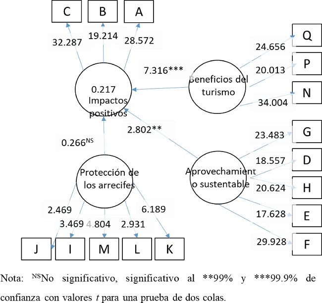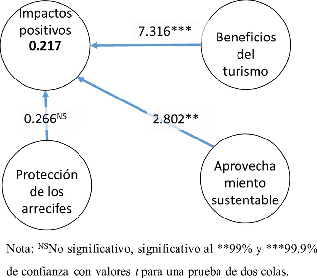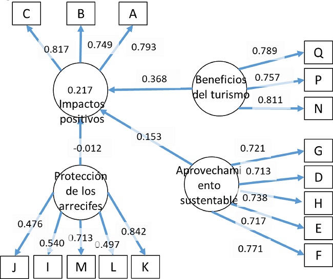 De forma simplificada, la figura 3 presenta el resumen de interrelación entre los distintos componentes teóricos del modelo, en donde se puede apreciar que “Beneficios del turismo” y el “Aprovechamiento sustentable” son significativos, mientras que la protección de los arrecifes no logra significación estadística.