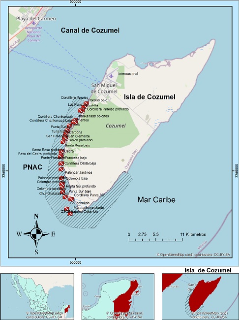 La zona de estudio se constituyó con la isla de Cozumel, ubicada en el estado de Quintana Roo, en la zona del Caribe. Presenta una extensión aproximada de 48 km de norte a sur y 14,8 km de este a oeste (Instituto Nacional Estadística y Geografía, 2010). De acuerdo con los datos de la Encuesta Intercensal del INEGI (2015), el municipio cuenta con 86 415 habitantes. La Isla presenta cinco áreas naturales protegidas: Parque Natural Laguna Chankanaab, la Laguna Colombia, la Reserva Ecológica Punta Sur, el Parque Nacional Arrecifes de Cozumel y el Área de Protección de Flora y Fauna isla Cozumel.
