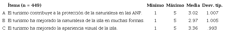 Como primera parte del análisis de los resultados descriptivos se agrupó cada uno de los ítems del cuestionario de acuerdo con las dimensiones del modelo teórico. En la tabla 1 se observa que la media de la evaluación sobre su percepción acerca de los impactos positivos hacia la naturaleza fue neutral, ya que las evaluaciones medias estuvieron cercanas a la calificación del rubro tres, que en la escala utilizada del 1 al 5, indica que no estaban de acuerdo ni en desacuerdo, con relación a la percepción de los impactos positivos que otorga el Área Natural Protegida sobre la naturaleza.