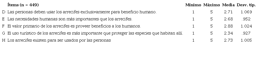 La tabla 2 presenta la opinión sobre la dimensión de aprovechamiento sustentable y cuyos resultados muestran en primer lugar con una media de 2.88 “el valor primario de los arrecifes es proveer beneficios a los humanos” y en segundo lugar con una media de 2.71 “las personas deben usar los arrecifes exclusivamente para beneficio humano”, de forma general con las afirmaciones planteadas se observa una percepción negativa con una media de 2.66.