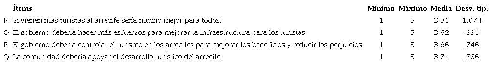La tabla 4, presenta la opinión sobre variables de la dimensión de beneficios del turismo; éstas se encontraron en 3.65 en la escala que del 1 al 5, lo cual implica que los encuestados estuvieron de acuerdo con las afirmaciones planteadas, entre las cuales destaca con una media de 3.96 aquella que afirma que el gobierno debería controlar el turismo en los arrecifes para mejorar los beneficios y reducir los perjuicios.