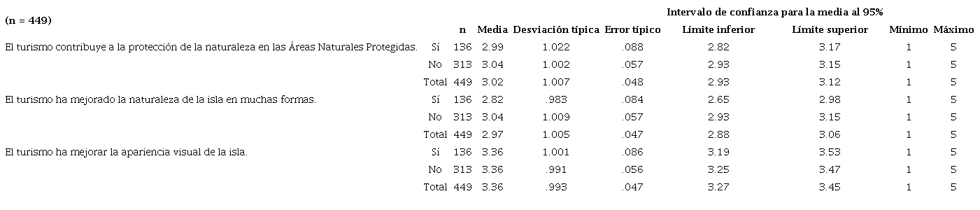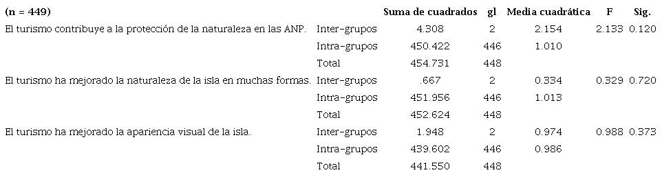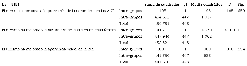 Para identificar si el trabajo turístico o el contacto con el turismo incidían en la opinión de los encuestados sobre este aspecto, se realizó un ANOVA de un factor. Los resultados se observan en la tabla 5. De acuerdo con las diferencias de medias, la afirmación sobre “si el turismo ha mejorado la naturaleza de la isla en muchas formas”, presenta diferencia estatisticamente significativa (0.031), esto implica que la opinión de la comunidad cambia dependiendo del grado de contacto con los turistas.