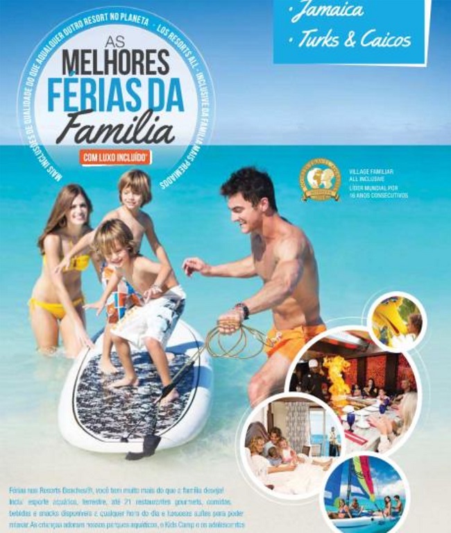Na propaganda de um resort (figura 2) há cinco imagens. A central traz um casal se divertindo na praia com os filhos. Nas imagens menores há: um grupo de amigos em um barco; um casal com crianças em uma cama; um grupo de pessoas em um restaurante e, na menor de todas, uma criança crespa beijando o que parece ser uma pessoa fantasiada. Uma atenção maior à figura da família na cama com crianças revela, bem ao fundo, um homem negro com uma bandeja na mão. A outra imagem, do grupo de pessoas em um restaurante, também mostra um negro que está trabalhando. Ambos os homens trabalhadores do turismo estão de uniforme.