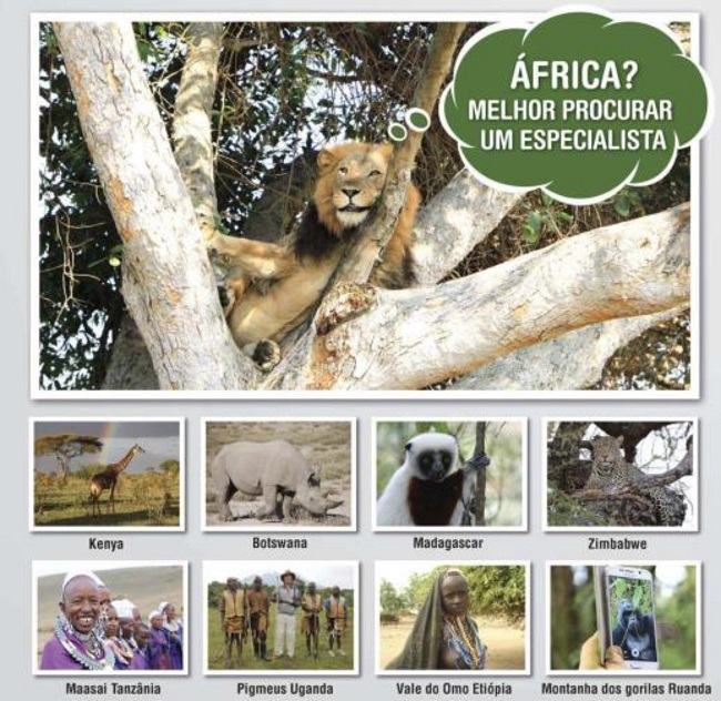 Começo pela categorização em que o negro mais apareceu na publicidade, como atrativo. Foram encontradas sete imagens publicitárias nesta categoria, todas de uma agência de viagens que anunciava pacotes para o continente africano – como pode ser visto na figura 3. A análise das últimas dez edições mostra que as imagens se repetem nas edições n. 18 e n. 20. A publicidade da edição n. 24 é da mesma agência, mas com imagens diferentes, porém próximas às mostradas aqui.