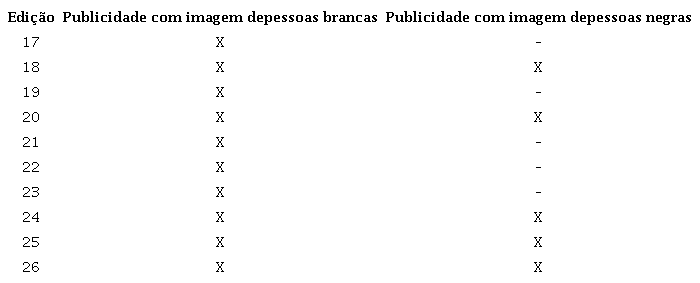 A análise da publicidade, revelada no quadro 2, traz as edições em que havia imagens de pessoas brancas e negras e mostra que, em metade das revistas analisadas, não havia negros.