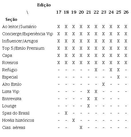 as seções por ela produzidas: Ao leitor/Sumário; Concierge/Experiência Vip; Influencer/Artigos; Top 5/Estilo Premium; Capa; Roteiros; Refúgio; Especial; Alto Estilo; Lista Vip; Entrevista; Lounge; Spas do Brasil; Hotéis Históricos; Cias. Aéreas;