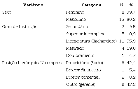 A partir da Tabela 1, constata-se que o perfil dos respondentes é majoritariamente masculino (60,2%). Este resultado vem corroborar a predominância da presença masculina na gestão hoteleira. Verifica-se ainda que a maioria (55,9%) possui grau de instrução licenciatura completa e (10,9%) superior incompleto. A maioria dos gestores são gerentes (43,8%) e proprietários (42,4%). A minoria são diretores comerciais (8,2%) ou financeiros (5,4%).