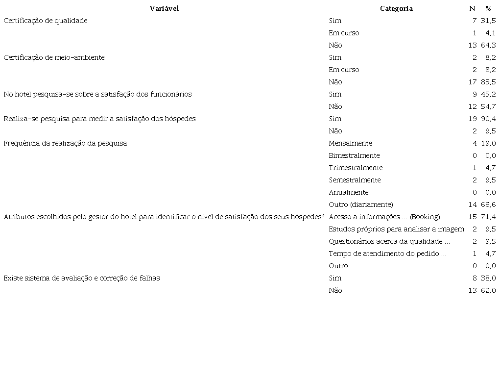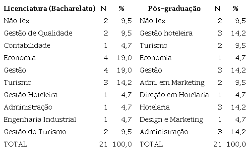 Constata-se na Tabela 2 que as Licenciaturas mais frequentes são Gestão, Economia e Turismo, totalizando 52,2%. Apenas 9,5% dos respondentes não fizeram pós-graduação, dos que realizaram pós-graduação 14,2% dos gestores fizeram mestrado em gestão, sendo 14,2% na área de hotelaria e 14,2% em administração, 14,2% também na área de gestão hoteleira e dois (9,5%) na área de turismo. Para Leite (2004), um aumento nos cursos de pós-graduação, por exemplo, poderia vir a suprir carências na melhoria gerencial.