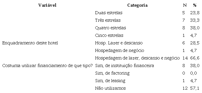 Pode-se observar na Tabela 3 que 57,1% dos hotéis são classificados como de duas ou três estrelas. Quanto ao enquadramento dos hotéis, a maioria, correspondendo a 66,6%, enquadra-se no tipo de hospedagem de lazer, descanso e negócio. Essa abordagem mista tem uma percentagem elevada e este resultado, de acordo com Leite (2004), deve-se ao fato de que durante a alta estação alta os hotéis recebem, na quase totalidade de sua oferta, hóspedes para lazer e descanso, mas na estação baixa lançam pacotes atrativos para a hospedagem de negócios. Desta forma, os hotéis conseguem diminuir os efeitos da sazonalidade. Ainda se constata na Tabela 3 que a maioria, representando 57,1%, não utiliza qualquer financiamento bancário. Esse dado demonstra que são poucos os hotéis de Braga que se encontram endividados, inclusive nenhum usa formas de financiamento factoring.