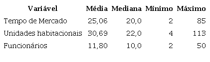 As informações apresentadas na Tabela 4 apresentam três variáveis, tempo de mercado, unidades habitacionais e funcionários que, em média, são respectivamente 25 anos, 30 unidades habitacionais e 11 funcionários, o que significa que os hotéis são em geral medianos.