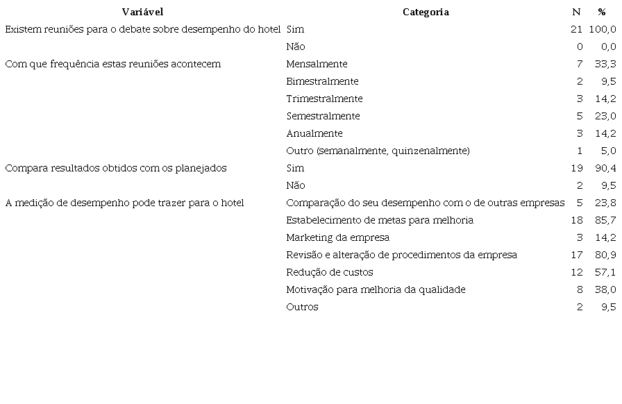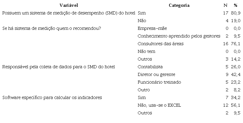 No que se refere à gestão, o estudo evidenciou que 81% dos hotéis utilizam Sistema de Medição de Desempenho (SMD) e que parte destes (56,1%) faz a utilização de um sistema de desempenho com indicadores calculados através do EXCEL. Em todas as empresas hoteleiras pesquisadas são realizadas reuniões com o objetivo de debater sobre o desempenho e a maioria compara os resultados com o que foi planejado.