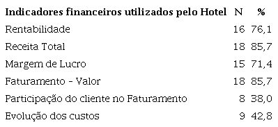 A Tabela 8 apresenta os indicadores de desempenho financeiro utilizados pelos hotéis. Observou-se que os indicadores mais utilizados, com percentual acima de 80%, foram: Receita total e Faturamento (ambos com 85,7%), seguido da Margem de lucro com 71,4%. O indicador participação do cliente no faturamento foi o menos utilizado com destaque de 38,0%.