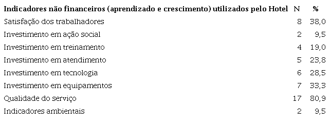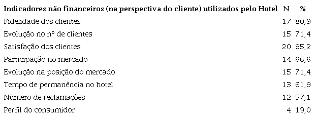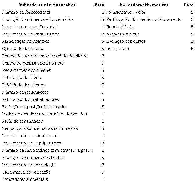 Portanto, constata-se que os hotéis dão mais importância aos indicadores financeiros do que aos não financeiros (3 a 5, quase sempre 5), enquanto que nos indicadores não financeiros, os mais importantes, são os que induzem resultados a curto prazo (como, por exemplo, a fidelidade de clientes), enquanto os que induzem resultados a longo prazo como a formação dos trabalhadores e o investimento em tecnologia só atingem um valor médio (3).
